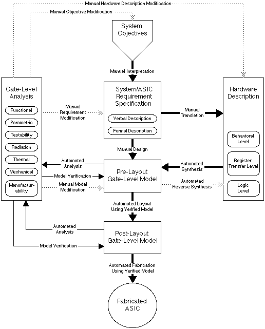 The flow can be summarized as follows. Beginning with system objectives, the user defines ASIC and system level requirement specifications, using verbal or formal methods. Engineers implement these specifications by designing the ASIC at the gate level, or by translating these specifications to a hardware description language (HDL) which in turn synthesizes (produces) a gate-level model. HDLs can model at the behavioral, register-transfer, and logic levels. Designers then simulate their gate-level models, using all or some of the following automated analyses: functional, parametric, testability, radiation, thermal, mechanical, and manufacturability. These analyses either verify the pre- and post-layout models, or reveal the need to manually modify the model at the gate, hardware description, specification, or system objectives level.