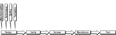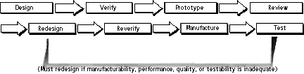 To compare the differences between serial and concurrent engineering, compare figure 1.3.1 with figure 1.3.2. Traditional ASIC projects involve engineering disciplines serially (figure 1.3.1), without much consideration about each discipline up front. This invariably requires prototypes and sometimes several redesigns to gradually incorporate divergent issues such as manufacturability, performance, quality, and testability into the ASIC. ASIC CE (figure 1.3.2) involves all engineering disciplines that will ever be used in the project early such that the first design will efficiently incorporate each discipline's concerns. Doing so ideally produces a working ASIC without the need for redesign.