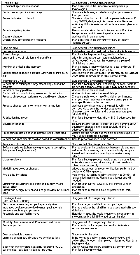 For an example of contingency planning, consider risks associated with ASIC function. First, to assess risks, understand how well available ASIC technologies can implement the ASIC's function. To minimize risk, choose a target technology that has successfully implemented a design of comparable density and performance. Then, as a contingency, secure plans for using backup technologies that can also implement the ASIC's function, should the target technology fail.