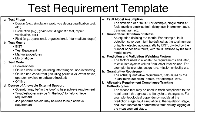 A multi-step procedure was developed to achieve a consolidated requirements set having significant commonality across design, manufacturing, and field deployment project phases. First, candidate requirements were selected by a team consisting of engineers and test support personnel with design, manufacturing, and field test expertise. Each individual represented his/her own area to ensure that explicit customer requirements would be met in each of the life cycle phases and to ensure that any derived requirements (not explicitly stated by the customer), needed to build quality and, reliable equipment would be added to the formal requirements list. Requirement templates designed to unambiguously quantify requirements and the means of their measurements were used to ensure sufficiency and consistency of representation of the requirement information. These populated templates were the primary output from the requirements generation process. The content of a requirements template is shown in Figure. 4-2.