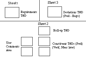 Figure 4-4 identifies the contents on the worksheets for one TSD class (requirements, prediction, verifications, or measurements) in one EXCEL workbook. For the sake of analysis, a Rrequirements TSD set will be discussed.