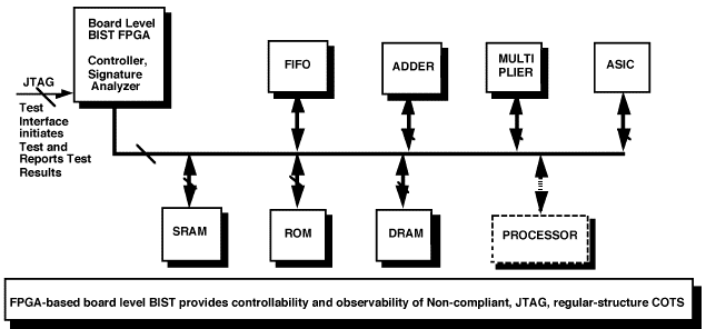 If memory components can be tested independently, the need for a software-based processor-controlled test that requires much of the board to be functional before memory testing can begin, is eliminated. A simulation (complete with testbench) of an FPGA which addressed and write/read data to each memory cell of a 256K x 4 static RAM to validate its storage ability was successfully executed. This is a promising new technique which can extend test coverage to complete arrays of components which have traditionally not been independently testable. Another desirable feature of FPGA-based board level BIST is the same testing is available for both manufacturing and field testing. LogicVision has announced a commercial product (memBIST XT) which is capable of installing an FPGA-based memory test capability at board level.