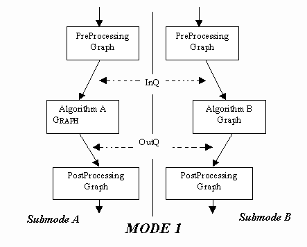 from SubmodeA to SubmodeB consists of disconnecting InQ and OutQ from Algorithm A and reconnecting them to Algorithm B. Although not shown on the figure, there may be parameters for any of the graphs that also need to be loaded on the submode transition. For example there could be a parameter for PostProcessing that reconfigures a