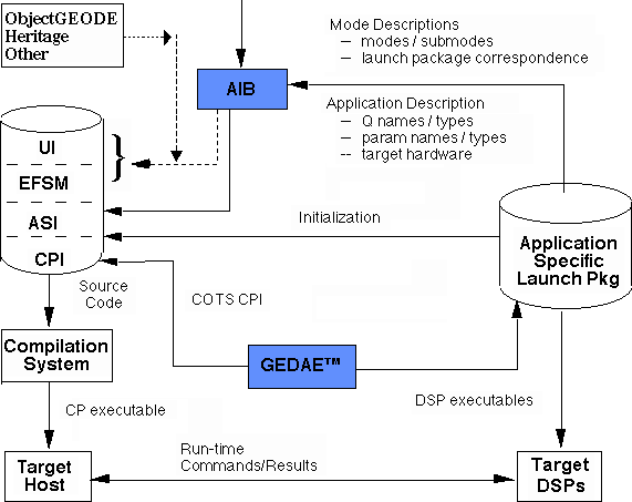 Application Specific Interface Builder (AIB) is the prototype tool used to construct the ASI. AIB's inputs and integration with GEDAE are shown in Figure 5 - 3, System Software Developed with AIB/GEDAE. The first step in constructing the ASI is to develop graphs using the GEDAE development environment. Once the graphs are completed and tested in the GEDAE environment, GEDAE will build an application specific launch package. The launch package contains the DSP executables as well as corollary information needed for program instantiation and initialization. The AIB user provides a small text file describing the mode/launch package association and the submode queue topology and parameter set filename. The launch package corollary information is readable by AIB and provides AIB with a description of all queue and parameter names and their data types. AIB then constructs the ASI functions, which can then be integrated with EFSM and UI level source code to complete the CP.