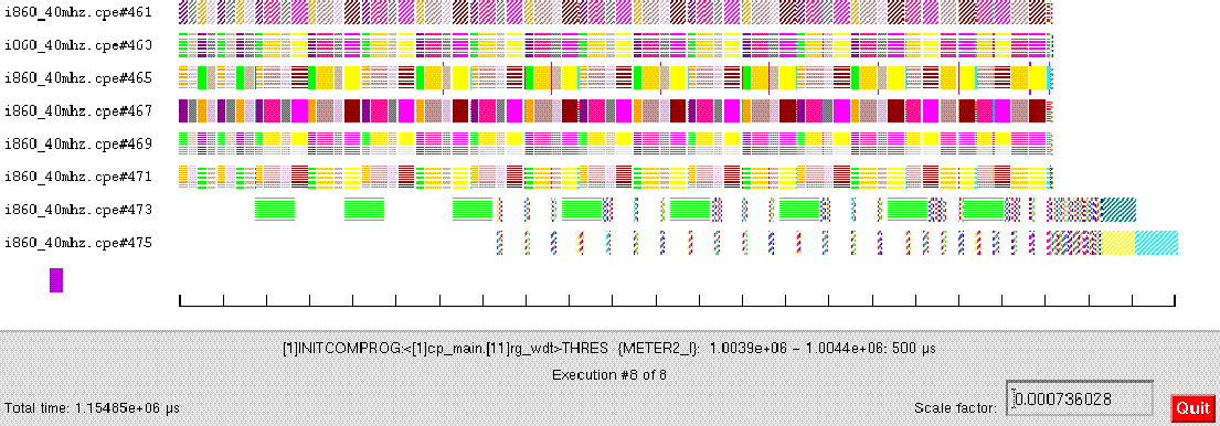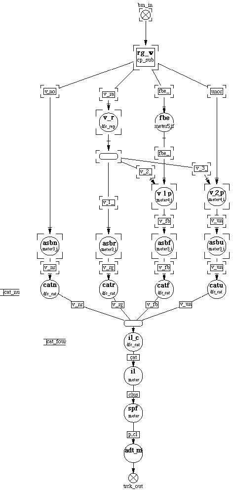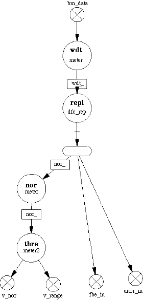 The family output data streams were then combined as shown using the CAT node. The Processing was then completed by as set of sequential nodes. This DF graph design was tested with sequential data streams and the integrity of the DF design established. By using a performance simulation tool and assigning representative processing time for the processing nodes (meter nodes) a execution time line was developed. This is shown inn figure 3-12.
