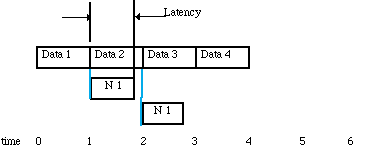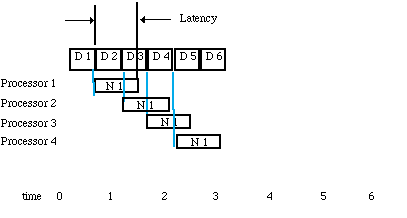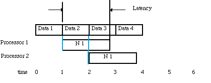 This block size can be found by equating the block arrival rate to the block processes time as shown in Figure 3-3. In the case where there is no solution for any block size or it is impractical to use the solution block size, then the processing must be parallelized as shown in Figure 3-4. The parallelization procedure begins by inserting a Splitter node which will send the first block of data to node1 and the second block to node2 etc. If the nodes are distributed to separate processors then the time line shown in Figure 3-5 results. For this method of parallelization the timeline shows that the latency that is greater than one block processing time. In this case, the latency can be decreased by using a smaller block size and using more processors and this is shown in Figure 3-6. This figure shows that we have cut the latency by a factor of two by increasing the number of processors by a factor of two. This is possible when the processing time is a linear function of the block size.