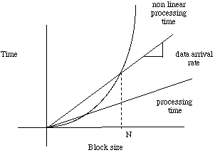 Usually data arrives at the input queue in a steady rate and this data must be processed sequentially by a computation node as shown in Figure 3-1 There are two methods of processing blocks of data so that the processing can keep up with the input data rate. The first method assumes that the node can complete the processing of the first block before the second block shows up. In this case, as shown in Figure 3-2, the latency or the time it takes to produce the results of processing the first block of data is less than it takes to process a block of data. If there exists a nonlinear trade off curve between block size and processing time, a block size can be determined that allows the computation rate to keep up with the data arrival rate.