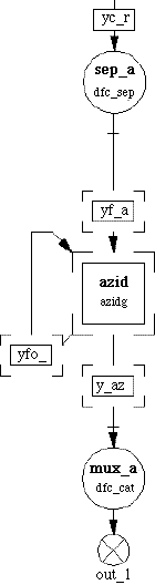 When the input rate is large compared to the processing rate we can assume that the input queue is filled instantaneously. In this situation, the split and merge can be replaced by the Separate and Concatenate node. These operations are functionally similar to the split and merge nodes but the Sep node requires that the N blocks are present in the input queue before the node fires. N is the number of streams that the input block will be separated by the Sep processing node. Similarly the Cat node takes the N input nodes and following the DF rules fires when all the N input queues to this node are present. This combination of nodes is shown in Figure 3-7. In the figure the sep_a node uses the dfc_sep primitive and the mux_a node uses the dfc_cat primitive. The usage of the Sep - Cat pair is similar to the Split - merge pair but the Sep- Cat obeys the Data Flow rules and does not require the additional control queue that insures that the proper firing sequence is maintained.