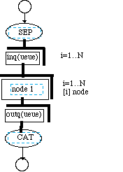 In DF graphs we introduce an important notational construct that supports parallelization and it is family construction. By the use of this construct, a group of nodes and or storage queues may be vectorized. The individual entities are directly addresses by an index. This convenient notational technique allows the graphs to be simply constructed. For example if a Sep and Cat operation are used, the intervening node can be put into a family index notation. The family notation is shown conceptually in Figure 3-8. In this case the output of the Sep node is put into inq family of queues indexed by i = 1..n. In this example we feed [i]inq to [i] node and feed the output queues [1..n]outq to the CAT node. The Cat node is set to take a family of queues. The Family notation can be used on a graph that has routing complexity that is greater than the simple one to one routing shown in the example given. To accommodate this complexity a routing box can be inserted after inq to route the output of queue [i]inq to any node in accordance with a routing formula on the index i or expressed using a routing graph that can be explicitly drawn.