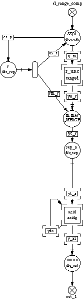 processing is shown is executed between the split and merge nodes and a Family notation is used for the range processing nodes. The external feed-forward queues are shown that feeds the control queue from the split node (dfc_swth) to the merge node. The addition of the dfc_rep node in this path was used because of the configuration of the dfc_swth node that was used to implement the control feed-forward. Since the azimuth processing could not proceed until a full frame of range data was processed, the azimuth processing uses a Sep and Cat pair. This pair was used to implement the corner turning required by the SAR processing. The processed range data could only be distributed only after the queue following the merge node contained a complete frames worth of data. A Transpose node could have been used to perform the corner turning but in order to perform the azimuth processing in parallel, a Sep node would still have to follow the transpose node. Therefore the transpose operation was performed by the Sep node in addition to the parallelization of the data stream. Again the azimuth processing nodes are represented using family notation.