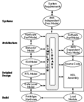 During the architecture design process, various simulations are performed at differing levels of detail as the design progresses. Early in the process, performance simulations are executed using high-level models of both hardware and software from the reuse library. Software is modeled as execution time equations for software primitives executing on various processors in the architecture. The architecture is described using token-based performance models for both the processing elements and communication elements. This level of simulation facilitates the rapid analysis of a broad range of architectural candidates composed of various combinations of COTS processors, custom processors, and special-purpose ASICs. In addition, many approaches to partitioning and mapping the software for execution on the architecture can be evaluated.