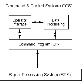 A typical large scale conceptual architecture is shown in Figure 3 - 4. It consists of a Signal Processing System (SPS) communicating with a Command and Control System (CCS). The Signal Processing System is that portion of the overall application that performs the high bandwidth "number crunching", is naturally represented by a data-flow model of computation, and typically executes on Digital Signal Processors (DSPs). Intimately related to the SPS, but frequently conceptualized as part of the Command and Control System is the Command Program (CP).