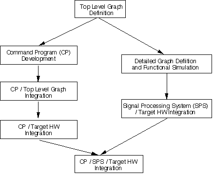 Another representation of the command program and signal processing software development process is shown in Figure 3 - 5. The first step is to capture the set of graphs to be controlled by the command program. This depends only on knowing the set of modes and submodes, which may already be defined in the procurement specification, and the top level assignment of signal processing algorithms to a set of signal processing graphs. Command Program development is not dependent on the detailed implementation of the signal processing graphs whose implementation is shown on the right hand side of Figure 3 - 5.