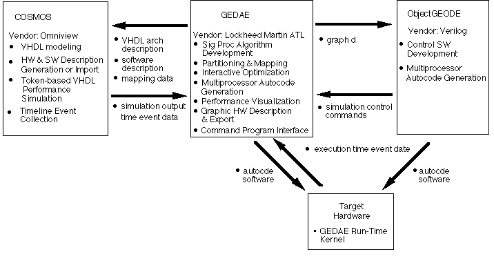 This overall process permits many of the above activities to be conducted concurrently. The integrated RASSP architecture toolset is based upon three tools, GEDAE from Lockheed Martin Advanced Technology Laboratories, Omniview Cosmos from Omniview Inc, and ObjectGEODE from Verilog SA.