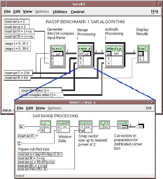 The familly of outputs is represented by the shadow around the source1 "out" label and the label "i" on the arc. In addition the output of each range processing family member is also a family which indicates that each section of data processed by one of the range processing functions is output as a family of outputs. When embedding this application, the individual family members are mapped to different processors for concurrent processing. Of particular note is that the alternating indices between the output of range processing and the input to azimuth processing specifies a distributed corner turn since the "j-th" output from the "i-th" range processor is routed to the "i-th" input of the "j-th" azimuth processor.
