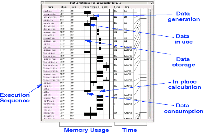 Embedded Code Generation - GEDAE provides an efficient autocoding capability driven by partitioning and mapping defined by the user. Because GEDAE handles all interprocessor communication, the designer never has to write any communication software. GEDAE launches the compilation, linking, loading and execution of the application on the embedded hardware. An embedded run-time kernel on each processor supports execution. GEDAE generates the execution schedule for each processor and provides the user the ability to divide schedules into sub-schedules which may all operate at different firing granularity to optimize performance. Execution schedules and memory maps are presented for analysis as shown in Figure 3 - 9.