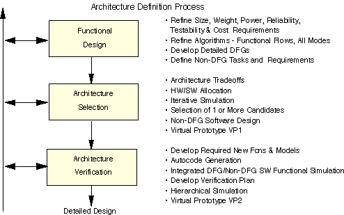 This architecture design phase of development involves the creating and refining of the DFGs that drive both the architecture design and the software generation for the signal processor. The input to this phase is the executable functional specification for a particular application and the command program specifications. We then partition and allocate the graph(s) to either hardware or software. During the architecture definition process, the DFG(s) of the signal processing is developed and the elements allocated to either hardware or software. We simulate the flow graph(s) from a functional standpoint and a performance standpoint until an acceptable hardware/software partitioning is achieved that meets the signal processing system requirements. This process contains many intermediate steps and graph objects defined in the following paragraphs.