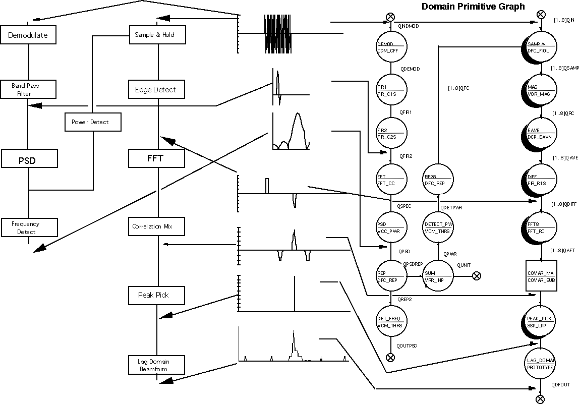 This figure shows an algorithm flow (shown as a functional block diagram) for a hypothetical application being translated into an architecture-independent DFG (domain-primitive graph). The domain-primitive graph is validated against the algorithm flows produced during system definition. A part of the validation of the domain-primitive graph is the creation of suitable test vectors. The domain-primitive graph is validated once the test vectors produce the same results predicted