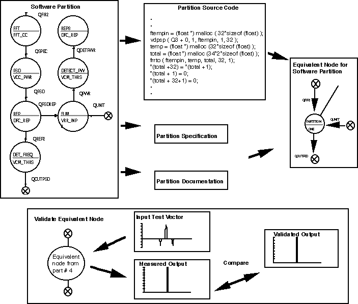 Figure7 - 16 shows the derivation of an equivalent node for software partition #1. The software partition is transformed into a stand-alone partition graph that is represented by source code, a partition specification, and documentation. We use the partition specification and source code to create an equivalent node for the partition, which has the same characteristics as the subgraph represented by the partition. We use the equivalent node to build an equivalent graph in which each node represents one of the original graph s partitions, either hardware or software. The equivalent node is validated using the same test vectors used to test the graph partition. This process is equivalent to the traditional software unit test.