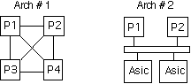 Given the DFG (or set of DFGs) that describes the processing, the architect must postulate one or more designs that may satisfy the requirements. These architecture choices are based upon the domain experience of the design team. One of the goals of RASSP is to facilitate the ability to define and evaluate more alternatives than would otherwise be possible. This is done through the use of the integration and semi-automation of the architecture tools that assist the DSP design architect. It is important to note that the processing represented by the DFGs at this point has not been allocated to either hardware or software. However, as the architect defines an architecture for consideration, one or more nodes of the DFG may be allocated to custom hardware or to a postulated processor that currently does not exist. Figure 7 - 6 shows two simple alternative architectures. In Arch #2, one or more nodes of the DFG have been allocated to either an existing or postulated special-purpose ASIC. In either case, the architect made a decision regarding hardware/software allocation. In Arch #1, all processing is performed in software on one of the four processors, while in Arch #2 some functions are constrained to the ASIC, while all others are allocated to software on one of the two processors. These architectures illustrate the point. In reality, the RASSP methodology must be capable of dealing with architectures that range from simple cases (such as those illustrated) to multi-chassis configurations of hundreds of processors. Architectures can be constructed from existing entities ranging from single processors to boards.