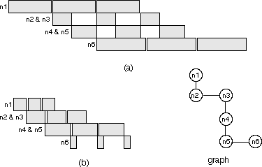 Figure 7 - 8 shows example timelines for the two architectures in Figure 7 - 6 for the 6 - node graph in the figure. The 6 - node graph is a simplified representation in which n1 and n6 represent the graph partitions allocated to hardware in Figure 7 - 6, and n2, n3, n4, and n5 represent the software partitions. Timeline (a) represents the mapping of the six graph nodes to the four processors shown in Arch #1 of Figure 7 - 6 and timeline (b) represents the mapping of the graph to Arch #2, which contains two-special purpose ASICs. The example illustrates a much improved overall timeline for the architecture when n1 and n6 are mapped to custom ASICs, all other processing being the same. The importance of the example is to illustrate that different architectures and graph mappings to those architectures can be evaluated quickly, which is especially valuable in large systems.