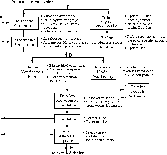 During architecture verification, we develop the next level of detail for one or more architectures that meet the requirements and satisfy the established selection criteria. We develop and validate any required library elements (either hardware or software) at this time if they are not completed concurrently. Autocode generation is performed for the DFG based software, and the non-DFG based software (particularly the command program) is developed. The next level of performance simulation should include timing estimates for the generated code, along with a representation of the operating system services, scheduling, and run-time system overhead. We generate a hierarchical validation plan that ensures that all component interfaces are tested. Detailed hierarchical simulations are performed to verify both functionality and performance on the target architecture. The virtual prototype, VP2, produced during architecture verification, represents a functional and performance description of the overall design.