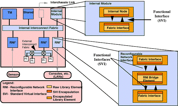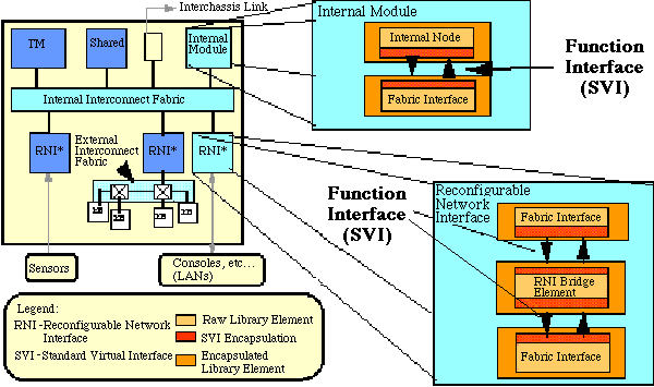 Figure 4 - 2 illustrates how the SVI is used to encapsulate elements of the functional architecture. An internal node can be a single processing element or cluster of elements connected as a single node to a processor bus. Examples of internal nodes include signal processors, vector processors, or shared memory. An interconnect fabric can be any type of interconnect. Examples of interconnect fabrics include XBAR-based, point-to-point interconnect networks, rings, and multidrop buses. Examples of networks include Ethernet, FDDI, Fiber Channel, 1553B, etc.