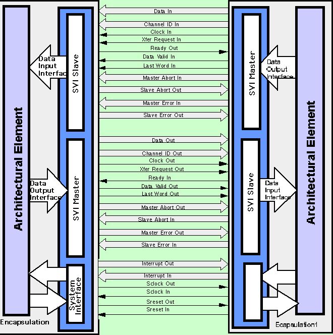 As shown in Figure 4 - 3, the data interface is partitioned into two unidirectional data interfaces: the Data Input Interface which receives incoming SVI messages, and the Data Output Interface which transmits outgoing SVI messages. The data interfaces are implemented with a master/slave pair: the SVI master is a data source to the SVI Data Output Interface, while the SVI slave is a data sink to the Data Input Interface. The encapsulation of a typical architectural element therefore contains an SVI master/slave pair. The advantage of partitioning the data path in this way is that it supports interface architectures with independent, concurrent data passing in both directions across the SVI. A bi-directional data interface can be obtained by using both unidirectional data interfaces controlled by the SVI master and the SVI slave.