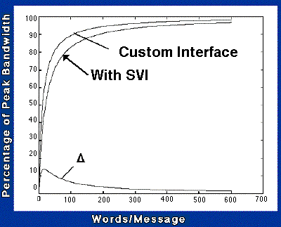 To supplement the signal/timing/protocol definition and support end users" modeling efforts, the appendix to this application note contains VHDL code templates for SVI encapsulations. These templates include the entities and architectures a designer would typically need to code an encapsulation. In section 4.4, links to the VHDL code for several of the encapsulations performed as part of the verification study are provided. The code provided for the HOTLink encapsulation and the encapsulated RNI bridge are executable provided the reader has access to the Synopsys Logic Modeling's Smart Model library. To date, LM/ATL has implemented several SVI encapsulations. An interoperability demonstration has been developed in which two processing elements, a custom vector processor and several interconnect fabrics (PCI, RACEway, Myrinet and one sensor interface (HOTLink)) were encapsulated. Several combinations of the processing elements and interconnects were then mixed and matched to demonstrate interoperability. The results, as shown in Figure 4 - 4 for an SVI encapsulated PCI bus versus a custom interface, demonstrate the ability to provide plug and play interconnect between different elements with minimal performance impact. In this configuration, for data transfers of more than 256 elements, the performance impact is less than 5% of peak bandwidth.