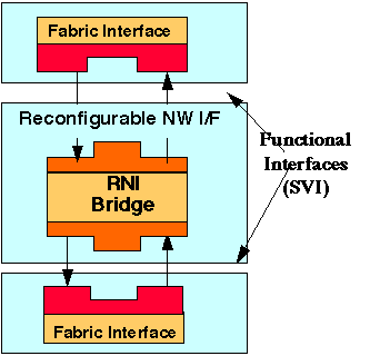 Interconnect-level interoperability is provided using a bridge node between internal and external interconnect fabrics called the Reconfigurable Network Interface node (RNI). An RNI node is constructed from two SVI encapsulations interconnected by a logical layer that ties the two interfaces together. These nodes are usually implemented using a dual-port memory or FIFO and programmable processor or embedded controller. The SVI and RNI are described in more detail in the following two subsections.