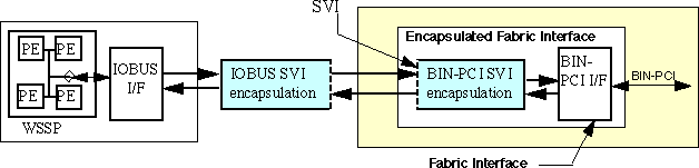 As in the case of Internal Module interface, a layered communication approach is employed. Since the RNI provides a bridge between two interfaces, two separate OSI-layered structures exist at each interface. The lowest layers of the two protocols are translated in the Fabric Interface components. The higher levels of each protocol are translated within the RNI bridge element and converge when the data interchange is stripped of all its interface specific identity, and exists as a pure SVI message on the SVI protocol. Again, the ISO/OSI model is being used as a reference and does not imply that the layering ultimately employed in defining the internal node architecture will strictly follow this model or implement all seven layers. An example of an encapsulated RNI bridge is described in [ Myri_PCI]. This model is executable if the user has access to the Synopsys Logic Modeling's SmartModel Library.