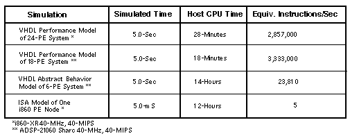 The VHDL virtual-prototype consumed 14 CPU-hours to execute 5-seconds of simulated runtime of a 6-processor version of the system. The simulated processor elements were Intel i860s which execute 40-million instructions per second. Because the virtual-prototype used abstract behavioral models of the processors, it does not explicitly model the individual instruction cycles. Considering the number of processors simulated, their instruction rate, and the duration of the simulation, the effective execution rate of the aggregate model was 23,810 instructions per second.