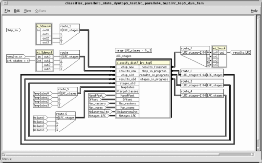 The size and complexity of this final DFG presented a number of problems. Initially, we were unable to get the autocode to load and execute on the 72 processor hardware configuration. The DFG was compiling and linking without errors, but the code would not initialize when downloaded to the embedded processors. The problem proved difficult to debug because the DFG would hang during initialization of the preprocessor DSP when trace table data is not available. In an effort to diagnose the problem the DFG was scaled back from 5 families of LRC to 3 families. When this DFG initialized properly, the problem was identified as a communication issue in the preprocessor function. Analysis of this function showed the 5 family DFG preprocessor function had over 180 data ports for transferring data to the HDI and MSE-LRC processors while the 3 family DFG had less 100 data ports. Based on this discovery, the preprocessor function was modified to combine the 3 HDI data ports into a single port reducing the total number of ports to less than 100. This resolved the problem and optimization of the final DFG could began.