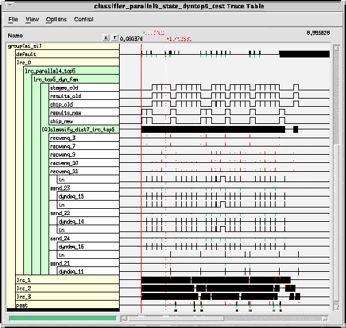 The original executable specification contained only ten target classes. Ten additional classes were provided during the detailed design cycle. Analysis of the new template statistics revealed the new classes increased the LRC processing time by 10%. To make up for this increase a change was made to the MSE DFG to increase its' efficiency. The MSE early termination approach results in longer execution times for the early template classes than the later classes. To eliminate this inefficiency, the MSE DFGs were modified to round robin the image chips into the four Sharcs and passing the partial processing results to the next Sharc in the four processor chain. This complicated the DFG but balanced processing times for the individual Sharc processors. This change in the LRC DFG resulted in a 12% efficiency improvement. The final DFG and a trace table showing the execution timing of the four distributed LRC DFG are shown below. This implementation resulted in a processing time of approximately 0.8 seconds per image chip per Sharc and higher than 95% utilization of the LRC Sharc processors for performing the MSE highly repetitive, data intense operation.