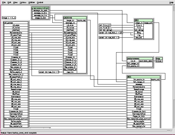 Some of the preprocessing functions required complicated, HDI specific, indexing, sampling and mathematical functions that did not exist as higher level primitives in GEDAEs function library. As a result, these unique functions were captured as DFGs using very low level library primitives (e.g. add, subtract, etc.). This approach lead to highly complicated DFGs with multiple levels of hierarchy which were difficult to follow or understand. These complicated DFGs later resulted in extremely large GEDAE execution schedules and lead to program memory problems. To resolve the latter problem, many of these original HDI DFGs were replaced by higher level HDI specific primitives which were not only more understandable but significantly more efficient. Additional details on the GEDAE DFG development efforts is provided in the HDI Data Flow Graph Development and Integration section of the case study.