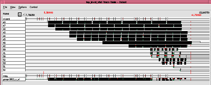 The ability to test and debug the top level DFG while the final MSE and HDI DFGs were being completed, resulted in the retirement of a number of hardware/ software integration issues prior to final system integration. Using the top level DFG, autocoding tool limitations were identified and corrected, compiler errors were detected and avoided, the COTs board operating system was tested and extended to provide the necessary memory features, and the DFG design itself was modified and updated to achieve the desired performance. Final timing results of the top level DFG running on 28 Sharc processors demonstrated processor utilization of more than 90% (illustrated below) and a throughput rate of approximately 10 image chips per second. A detailed description of the top level DFG development effort can be found in the Final System Hardware/Software Integration and Test section of the Case Study.