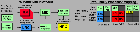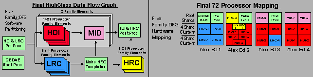 Integration of the HighClass DFG for the embedded processor boards was accomplished in two steps. The initial step was the development of an integrated DFG which incorporated the final MSE and HDI DFG but was limited to two families of MSE LRC processors and 16 HDI processors (referred to as the "two family DFG"). This DFG and the mapping of the individual processor functions to the Alex boards are shown below.