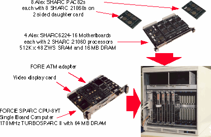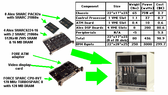 At the conclusion of the Architecture Hardware/Software Codesign cycle, the final prototype hardware configuration had be defined. Based on the selection of the Alex COTS Sharc boards, orders were placed for the four boards as well as a Sparc 8 control processor, an ATM interface card, the VME chassis, hard disk drive and the workstation peripherals needed to support integration and testing. The hardware used to implement the BM4 prototype is shown in the figure below. The combined cost for the prototype hardware was less than $100K, one third of the original proposal hardware costs.