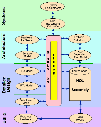 The RASSP development process in based on an integrated hardware/software codesign methodology as compared to standard practice which separates the hardware and software development activities after the initial hardware and software design requirements and specifications are established. In contrast, RASSP's codesign process is partitioned as a function of design abstraction level (i.e. system definition, architecture definition, and detailed design). At each level of abstraction, the hardware and software requirements and design issues are considered jointly. Combined hardware/software design solutions are investigated and developed. Integrated hardware/software virtual prototypes are used to evaluate and verify the evolving hardware/ software designs throughout the process. Figure 3 - 2 shows the various levels and types of hardware/software virtual prototype models that can be used to analyze test and verify candidate designs. Outputs from the design and virtual prototyping efforts are used to make design/cost benefit tradeoffs. Using these hardware/software codesign and virtual prototyping concepts allow developers to identify and resolve hardware/software integration issues throughout the entire development effort, instead waiting until the final hardware/software integration and test phase when problems can have significant cost and schedule impacts.