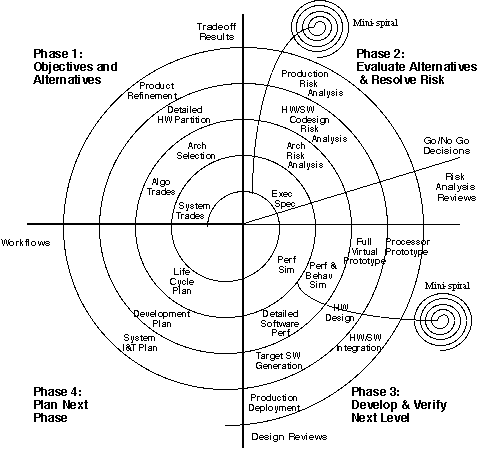 Each spiral cycle has four phases. In the first phase the baseline design and alternative approaches are identified for each element of the design. In the next phase the candidate designs are evaluated against the system the requirements, alternative approaches and design risks are identified, and risk retirement tasks are defined. In the third phase, design and virtual prototyping tasks are accomplished and results are evaluated to establish the best design approaches for further development. In some instances, design and/or prototyping activities lead to narrowing the hardware/software co-design space, while in other cases, information is discovered which uncovers higher payoff candidates. In the final phase of the spiral cycle, design and virtual prototyping results are reviewed and plans for the next cycle are established. In the course of a development effort "mini-spirals" can be spawned at any time to address critical design issues and retire schedule, cost or technical risks. These "mini-spirals" are focused on developing specific design data and information that is critical for making decisions for the next phase of the development effort.
