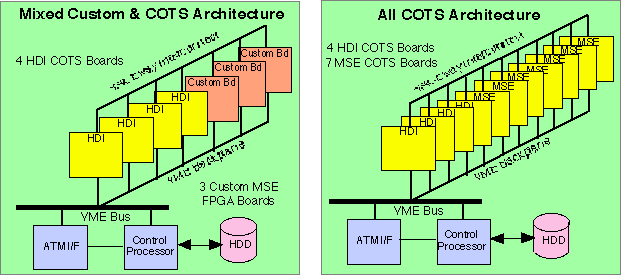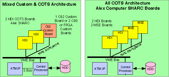 The mixed COTS/Custom Architecture and All COTS Architecture designs resulting from the Architecture Hardware/Software Codesign cycle are depicted below. MSE and HDI functional analysis and optimization efforts had resulted in a 4 board Alex Computer System board design (72 Sharc DSPs). While the c6201 mixed COTS/Custom design potentially had one less board, the cost and schedule risks for the custom design combined with the risk of implementing HDI on only 36 processors resulted in the COTS/Custom design approach being eliminated.