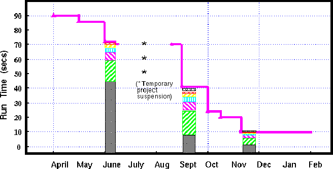The group settings file generated by GEDAE for creating the processors' execution schedules was extremely large (approximately 28000 lines). As a result, the display provided by GEDAE for analyzing and modifying the execution schedule exceeded the X windows display buffer memory limits. To overcome this limitation, a process was developed for converting the group settings file to a Microsoft Excel spreadsheet to review and modify the individual function queues, priorities, and firing granularity settings. This process combined with the hour or so of time required to generate the autocoded schedule slowed progress considerably. Changes to optimize data queue sizes, firing granularity, or individual function priorities were taking 2 to 3 hours. While this seemed quite long relative to smaller DFGs, compared to the normal time required to hand compile, link, load, and execute the code for a 72 processor application, it was a vast improvement. In the end using the GEDAE trace table data to analyze inefficiencies in the 5 family DFG, the final BM4 DFG was developed, optimized and tested in just over 2 weeks which represents a significant improvement over normal hand coded software integration efforts. Additional details on the final hardware/software integration effort can be found in the Final System Hardware/Software Integration and Test section.