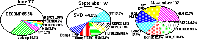Algorithm optimization efforts were accomplished by iteratively identifying and reducing the largest computation times of the individual HDI functions. The computational approach for the individual code elements were systematically analyzed and refined to reduce their complexity and computation times. The four most significant implementation and timing improvements were; restructuring the HDI loop structure, substituting faster sub-algorithms (e.g. replacing DFTs and time domain filters with FFTs, applying Horner's rule to matrices, etc.), decomposing a large matrix multiply with a factored version to take advantage of matrix symmetries, and replacing the original Singular Value Decomposition (SVD) calculation with a more efficient Modified Graham-Schmidt (MGS) routine. These along with other implementation improvements resulted in the runtime and operation count reductions shown in figure 3 - 6 and table 3 - 3..