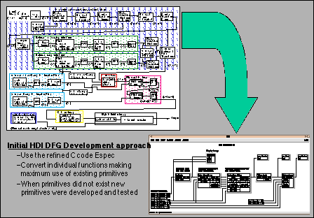 In the course of developing the initial HDI DFGs and primitives, a key lesson learned was that for complex flow graphs, a top down DFG design approach is crucial. Understanding the algorithm is essential to efficient DFG implementation. MIT/LL's HDI executable specification code, much of which had been translated from MATLAB, provided an accurate computational specification of the HDI algorithm. However, in many instances, MATLAB's use of computed array indexing and other coding constructs obscured the computational functions, made them difficult to understand, and did not provide a good implementation specification. As a result, literal translation of the executable specification C code into GEDAE primitives and DFGs was not an efficient approach for capturing the HDI algorithm. Once we realized this, many of the early, highly complex DFG's and primitives were rewritten as simplified, HDI specific C code functions and encapsulated as application specific primitives.