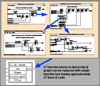 In the case of the HDI DFG many of the preprocessing functions required complicated indexing, sampling and mathematical functions specific to the HDI algorithm and as a result did not exist as GEDAEs library functions. As a result, these unique functions were captured as DFGs using very low level GEDAE library primitives (e.g. add, subtract, multiply, etc.). This approach led to highly complicated DFGs with multiple levels of hierarchy that were difficult to follow and understand. These complicated DFGs later created in large GEDAE execution schedules and increased program memory requirements. To resolve these problem, many of these HDI DFGs were replaced by higher level HDI specific C code primitives which were not only complicated but significantly more efficient. Figure 2 shows an example of the difference between a low level DFG versus a custom C code primitive.