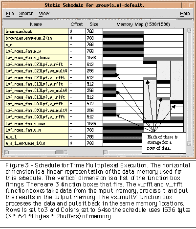 One opportunity to improve memory efficiency was the use of sub-schedules. "For loops" are generally used to process multiple data items that are processed identically. For example, if it is necessary to low pass filter (lpf) each row of a matrix, we would loop over the rows and apply the lpf to each row. In GEDAE there are two ways that can be done. First, you can demux the array into a family of vectors and apply the operation to each vector simultaneously. Conceptually this is a spatial separation that allows the developer to process each vector on a different processor as a family function. This provides an effective approach for distributing repetitive functions across multiple processors. However, currently there is a significant overhead associated with the family approach. Each family member is allocated as a separate instance of the function box, with its own data memory allocation. Nothing can be done to reduce this overhead. The second method to do this is to convert the matrix into a single stream of vectors (each row becomes a vector) and to process them sequentially (time multiplexing). This forces the processing to be done on a single processor. The time multiplexing approach creates only one instance of the function box, but will allocate the memory required to process all the vectors simultaneously (see figure 3). Fortunately, GEDAE provides the ability to sub-schedule the vector processing. The sub-schedule basically sends one vector at a time through the vector processing box. This significantly reduces the memory requirements (see figure 4).