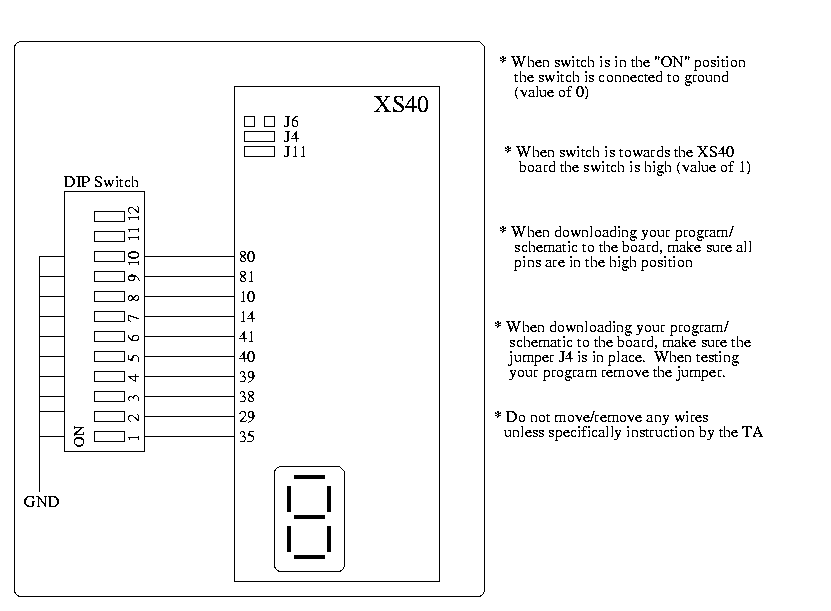 DIPconnect.gif | Schematic which shows the DIP switch connections to the XS40 board pins, shows the jumpers, and some tips on downloading unto the board. |