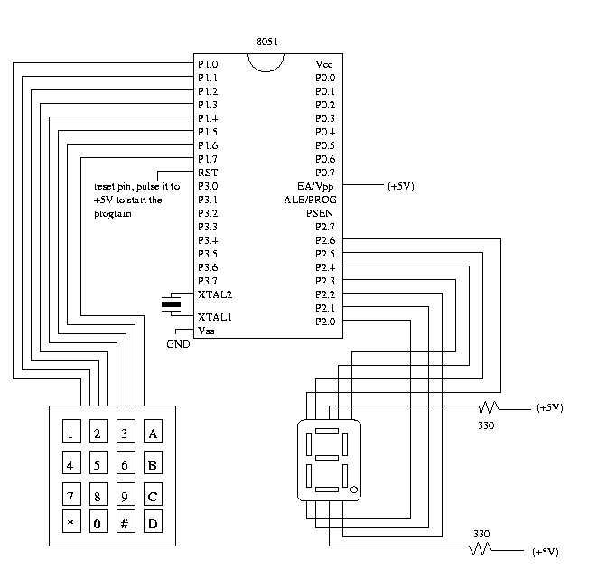 In this lab, you will be reading input from a keypad and display the corresponding button pressed unto a 7-segment display. You will be required to write a C program which will determine which key has been pressed on the key pad. The program will then display the corresponding character by configuring the output port correctly ( decimal counter lab discusses the 7-segment displays). The program will be compiled using the C51 compiler and burned unto an 8051 chip. A schematic is provided below to show connections needed to implement this lab.