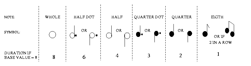 The second concern in playing a song is controlling the duration for which a given note is played. We can tell how long to play a note by looking at it's type. Let's say that we are given some base value X. A whole note would play for the entire base value duration. So, if X=8, then the note would play for 8 units. A half note would play half of the base value, this means that a half note would play for X/2 or 4 units. A quarter note plays for a fourth of the base value, X/4 or 2 uints. Between a whole note and a half note, exists a halfdot. This note's duration is in the middle of a whole note duration and a half note duartion, (X + 0.5X)/2 or in the case of X=8, 6 units. The quarterdot is in between a half note and a quarter note and plays for 2 units. Each of the durations we will be dealing with is seen above along with it's corresponding duartion and symbol(s). By chaning the base value X, we can speed up a song or make it slower. However, the ratio of how long a note will play compared to other is still the same. By varying the base value X, we vary the tempo.