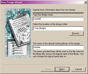 In the first wizard window you can enter your project name, its folder, the project type and the working library name. We use a counter design for illustration here.